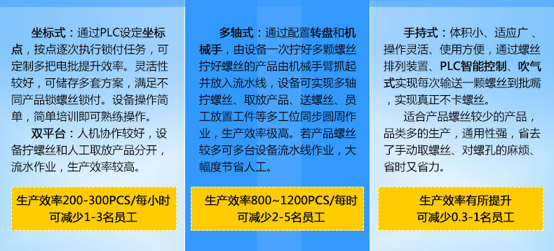 - 產(chǎn)品簡(jiǎn)介: 手持式自動(dòng)鎖螺絲機(jī)也叫手持式自動(dòng)螺絲機(jī)、自動(dòng)供料鎖螺絲機(jī)、自動(dòng)打螺絲機(jī)、自動(dòng)擰螺絲機(jī)等,嚴(yán)格來(lái)講,手持式只能算是半自動(dòng),因?yàn)樗€是需要手工操作。一臺(tái)手持式自動(dòng)鎖螺絲機(jī)主要由兩部分組成:自動(dòng)供料機(jī)和電批,其中自動(dòng)供料機(jī)是最重要的,也是最復(fù)雜的,它的好壞直接關(guān)系到機(jī)器卡不卡料的問(wèn)題。